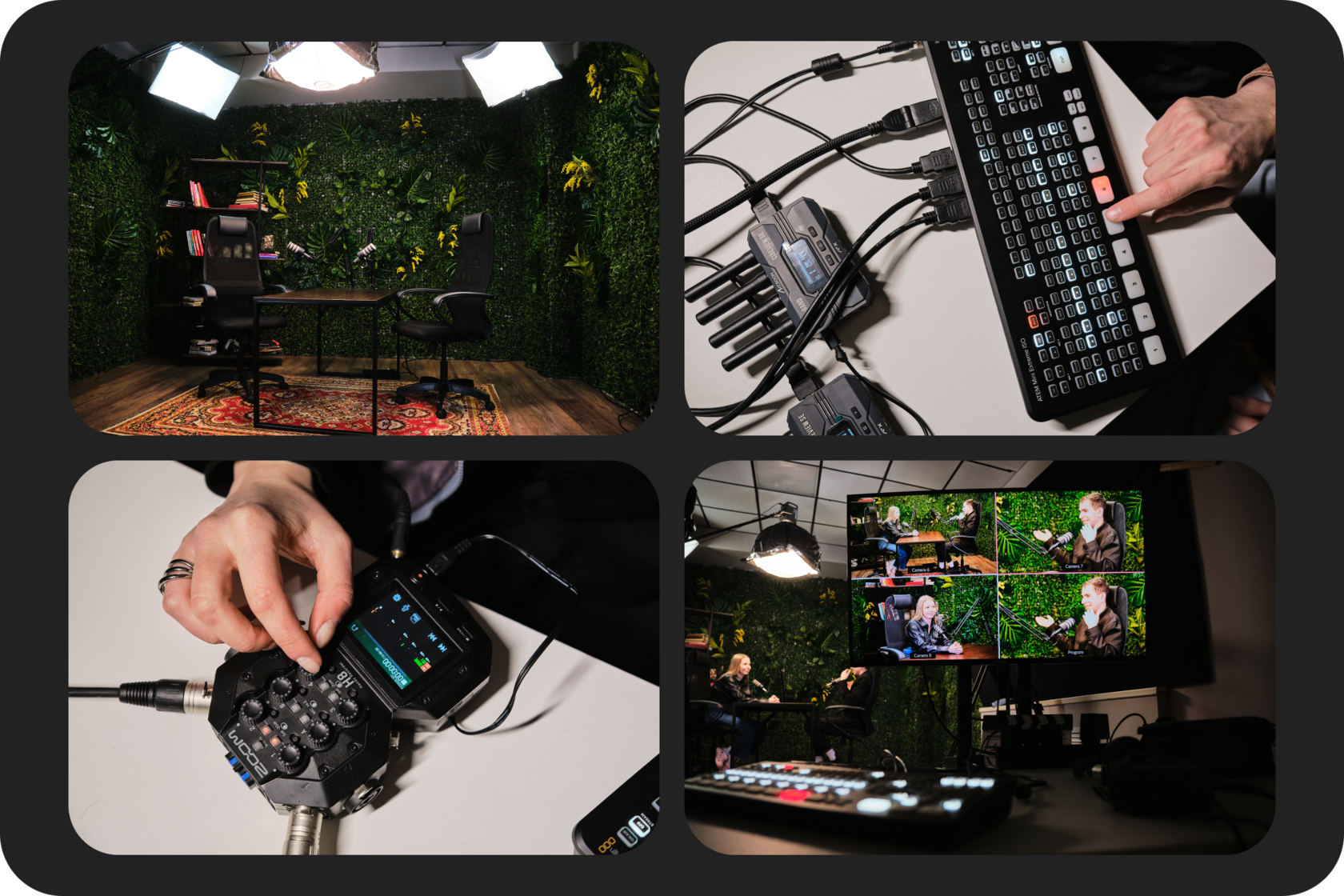 В основном это камеры Sony и Blackmagic, студийные микрофоны RODE PodMic и рекордер ZoomP4. Остальное оборудование можно задействовать по необходимости. исходя из ваших задач.